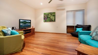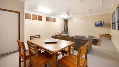 Pet friendly! The Great Barrier Reef Beach House is located on beachfront at beautiful Wonga Beach, just north of Port Douglas and is set in tropical gardens that feature palms and fragrant frangipanis. With four spacious bedrooms and multiple sitting rooms, this house easily accommodates a large group of guests. This beautiful home offers plenty of room to relax and unwind with a glass of wine. The home wraps around a large, solar heated pool with double sail cloth protection that allows sun safe day long swimming/lounging. The media room and rumpus room both have cable TV so you and the children can all be entertained without compromise. This is a light and airy home, perfect for rest and relaxation.