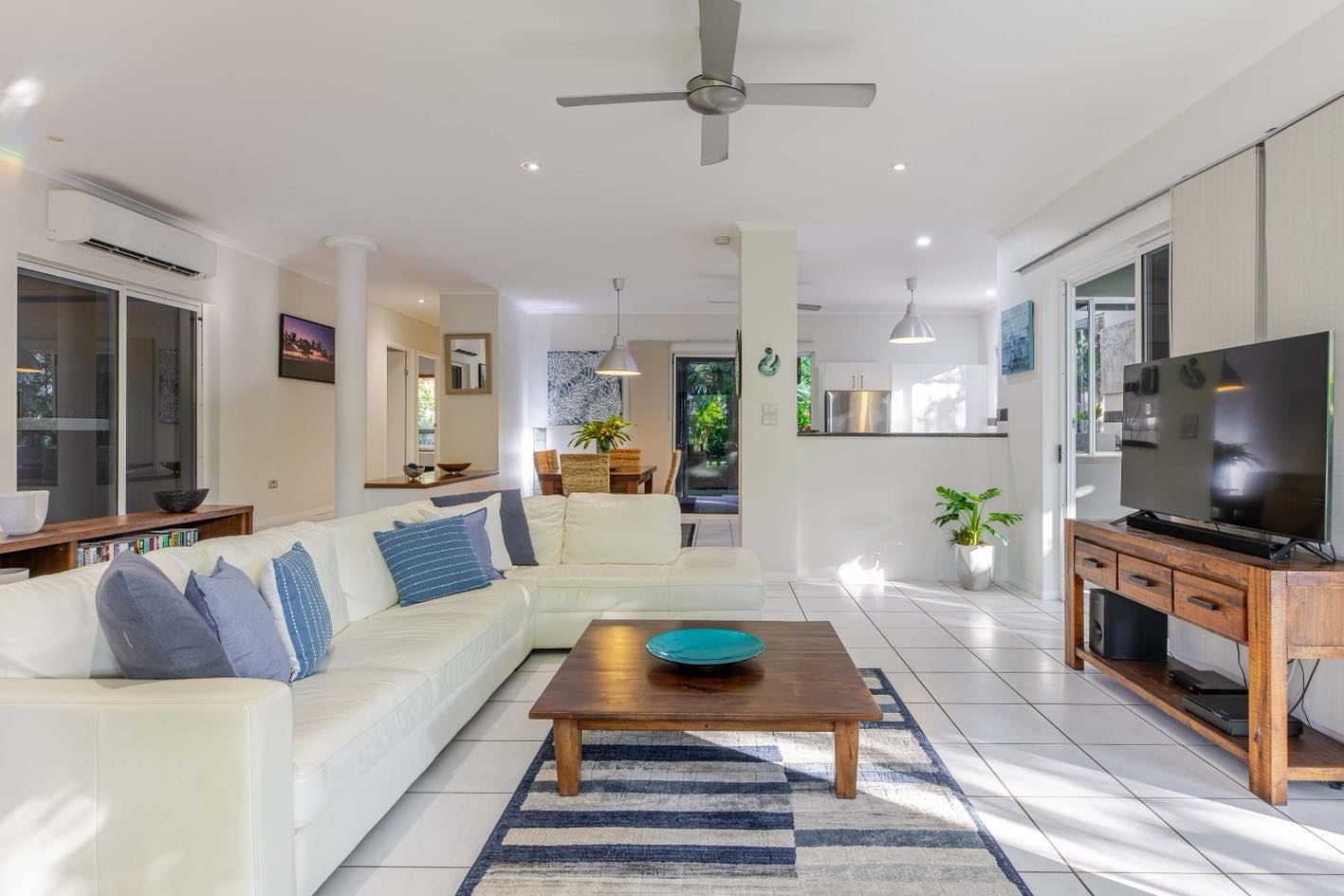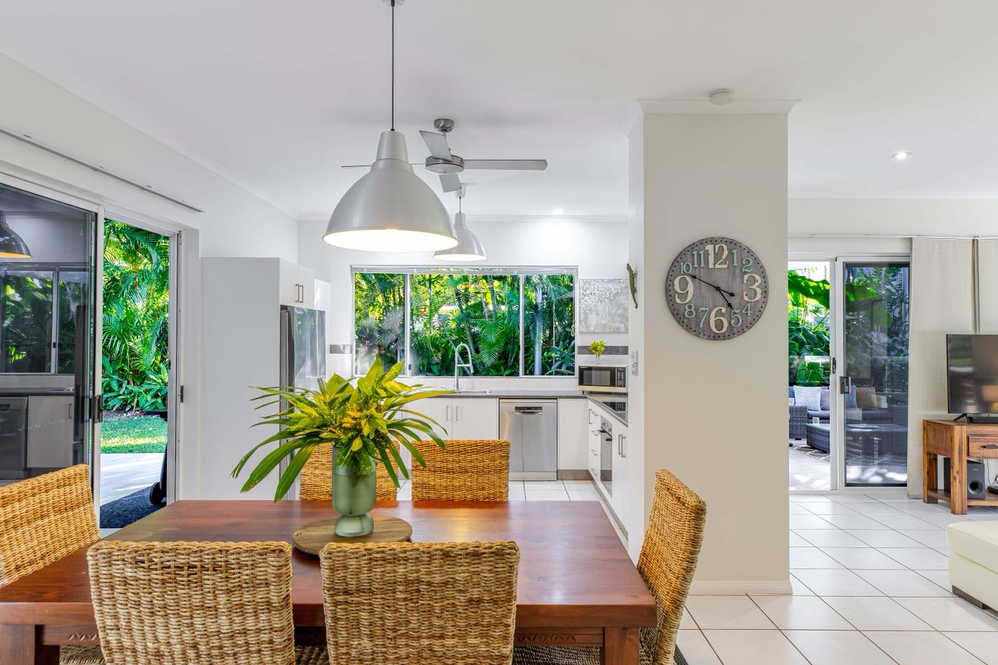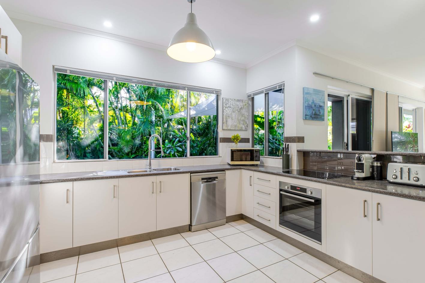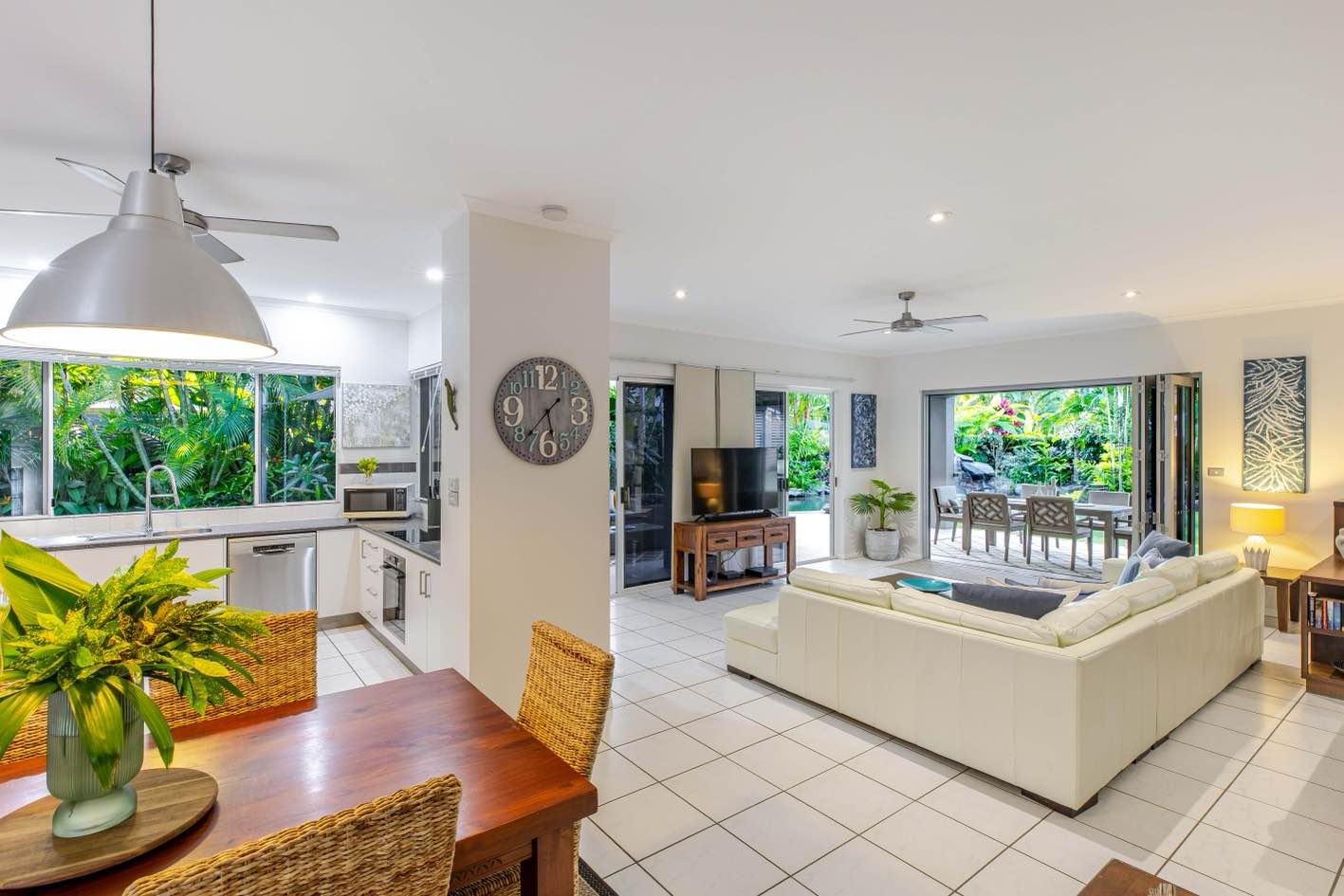 This spacious, single-level home features an open-plan living, kitchen, and dining area, ideal for embracing the relaxed coastal lifestyle of Far North Queensland. Natural light floods the space, complemented by the refreshing breezes from the nearby tropical gardens. The covered patio, complete with a BBQ and alfresco dining area, offers the perfect spot to enjoy the outdoors, while the expansive pool area is surrounded by lush greenery, making it an ideal place to unwind.The perfect place to chill. A true family retreat or couples getaway. Walking distance to restaurants.