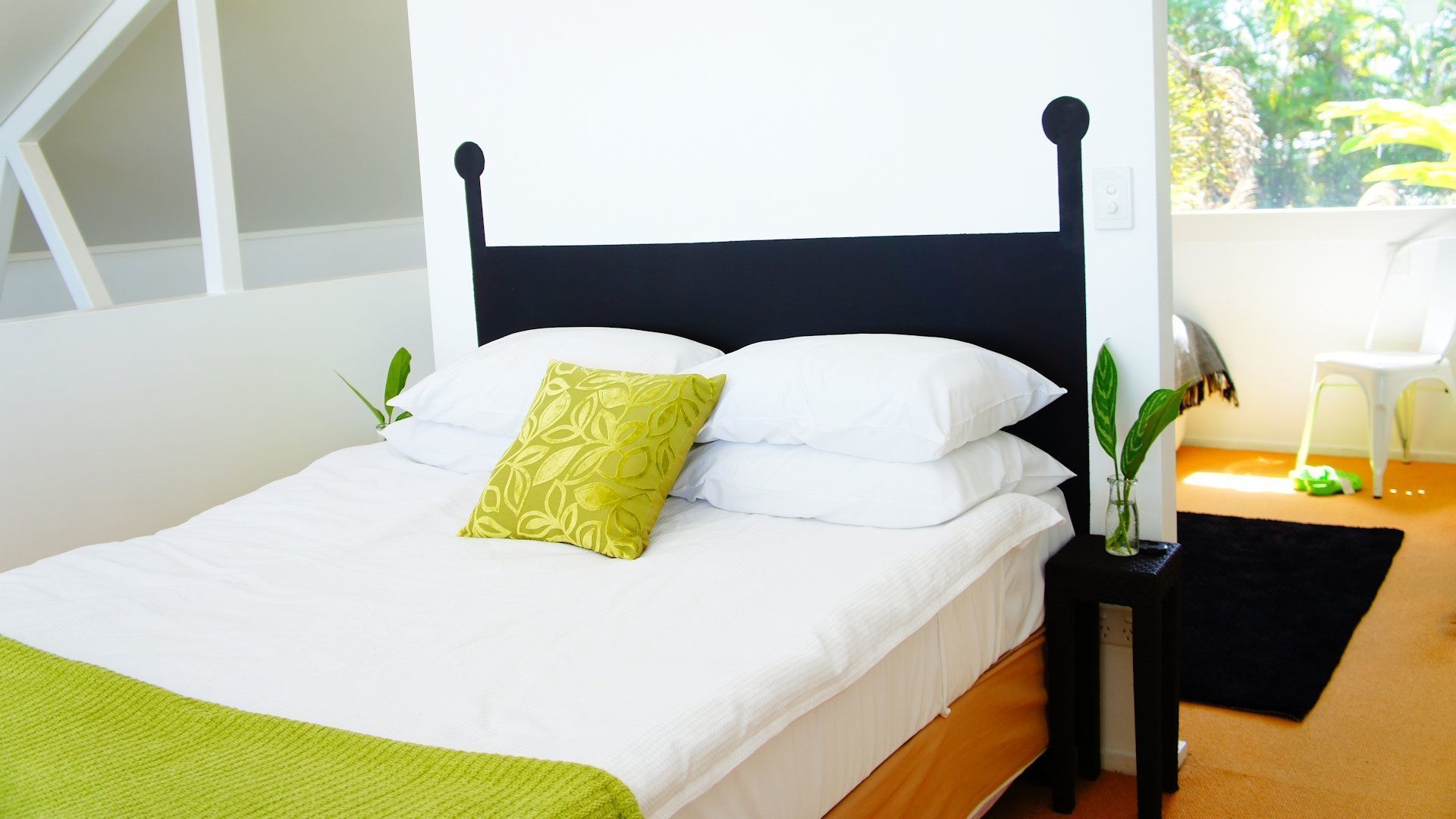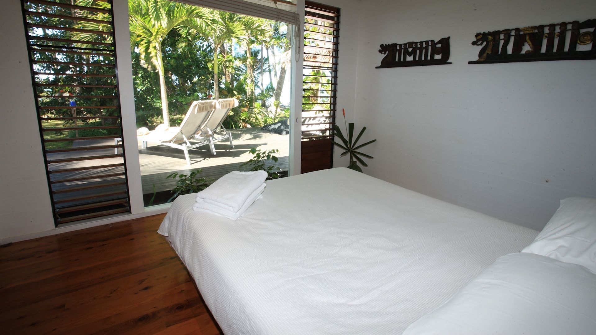 This Newell Beach holiday house features 4 bedrooms, with one located in an upstairs loft. Three bedrooms are located on the ground floor, the master with views to the ocean and another with views of the tennis court. A timber deck wraps around the front of the house creating a relaxing environment for entertaining, rest and relaxation. Grab a book and snooze on the day bed. Time out!