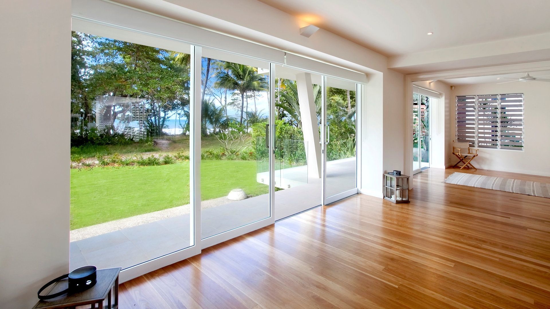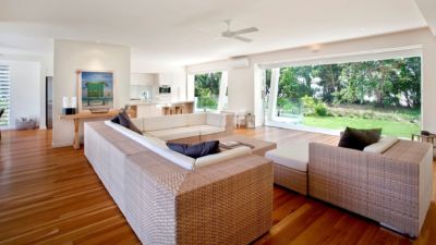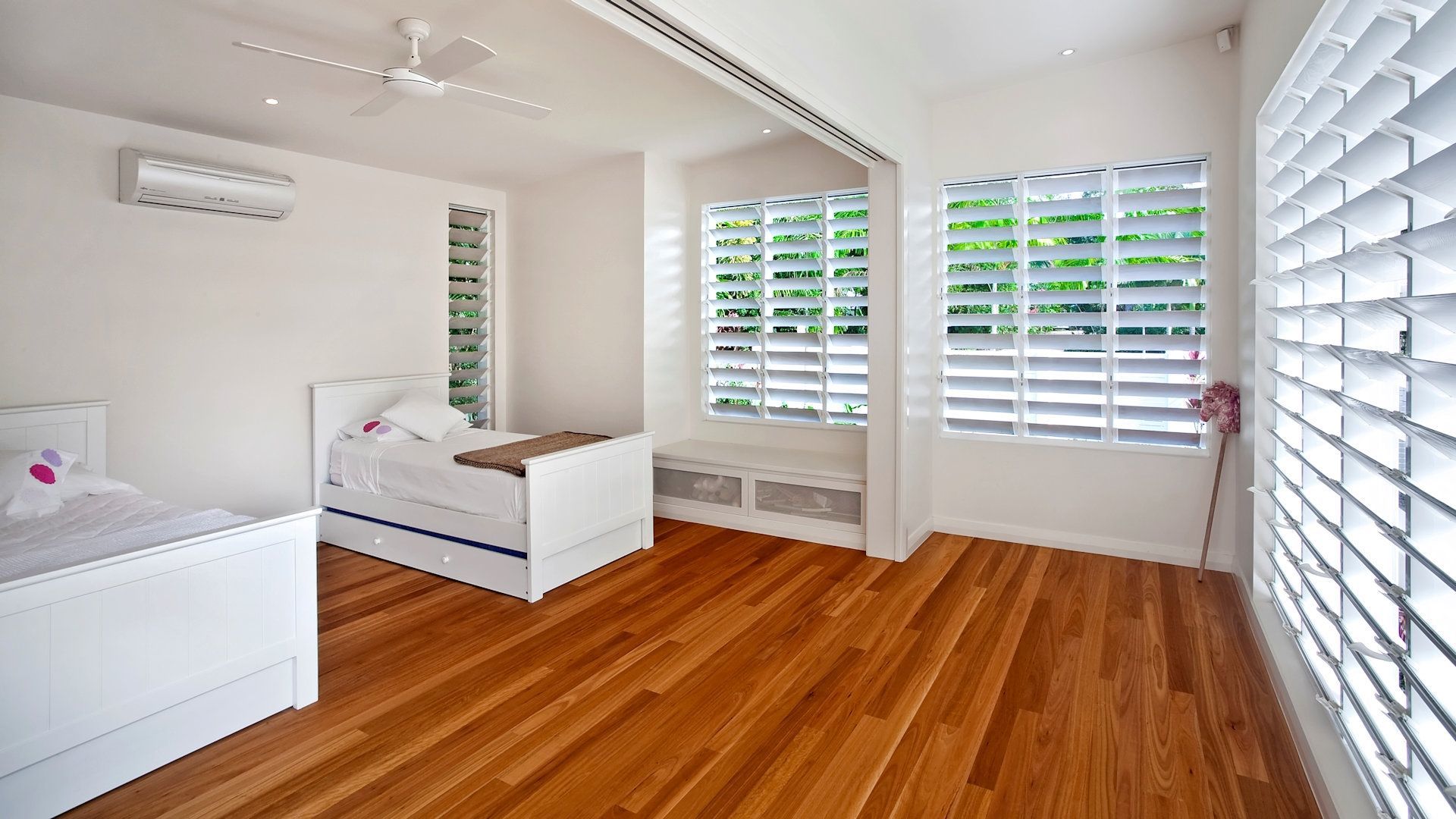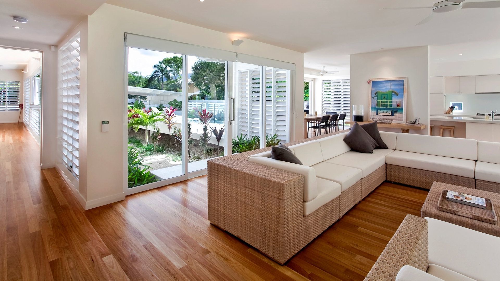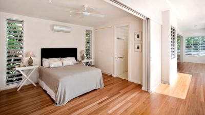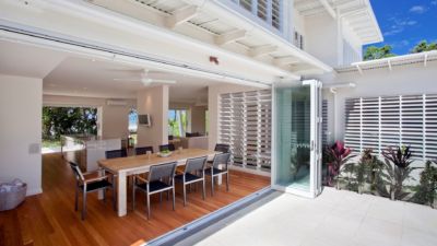 Interiors are bright, white and ultra-sized with limed shutters and wooden floorboards providing a warm contemporary feel. Downstairs an expansive open plan living area, complete with Dedon lounge setting, accesses the front balcony and main beach through stacking bay doors. Upstairs a second living area, complete with, bar, TV and Bose iPod music system accesses the top balcony with views over Dunk & Bedarra Islands. The house is connected with wireless internet and secured with an alarm system. Bedrooms can be closed off using huge sliding cavity doors or kept open for that breezy feel.