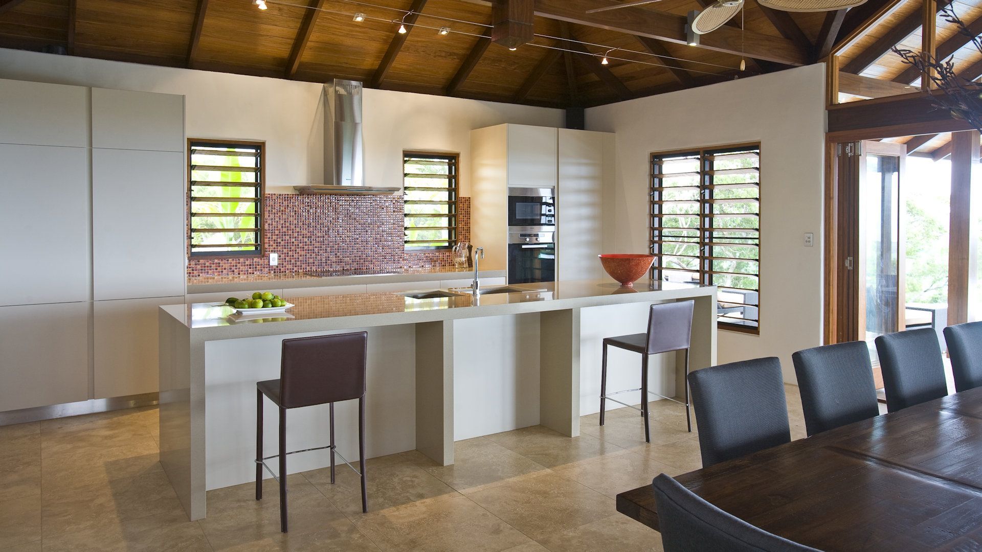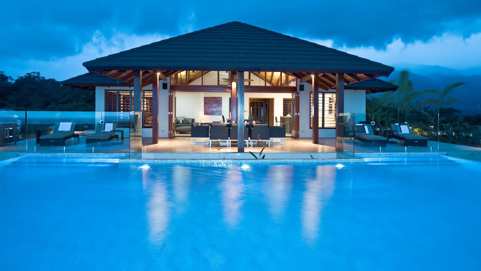 Designed by internationally acclaimed, award winning designer, Chris Vandyke and built by multi award winning Keith Tesch, the property features cascading water gardens that run alongside tropical pavilions.  The infinity pool with Italian glass mosaic tiles at the front of the master pavilion offers breathtaking views to Port Douglas and beyond. Three king bedrooms (and a Media Room) offer superior accommodation for up to 8 discerning guests. The pool pavilion features a generous lounge room, dining room and open plan kitchen complete with all the necessary modern appliances needed for a luxurious tropical getaway.