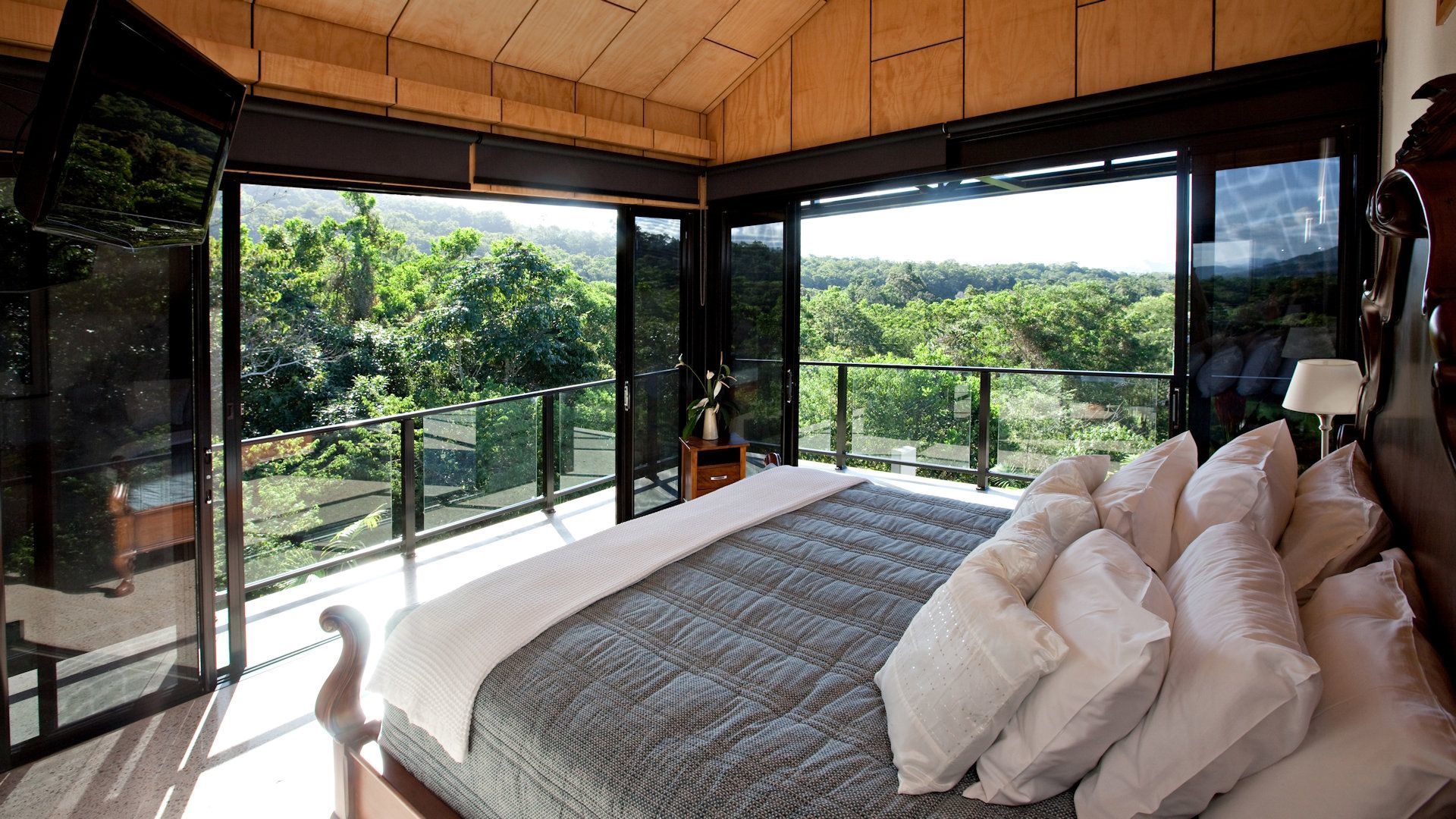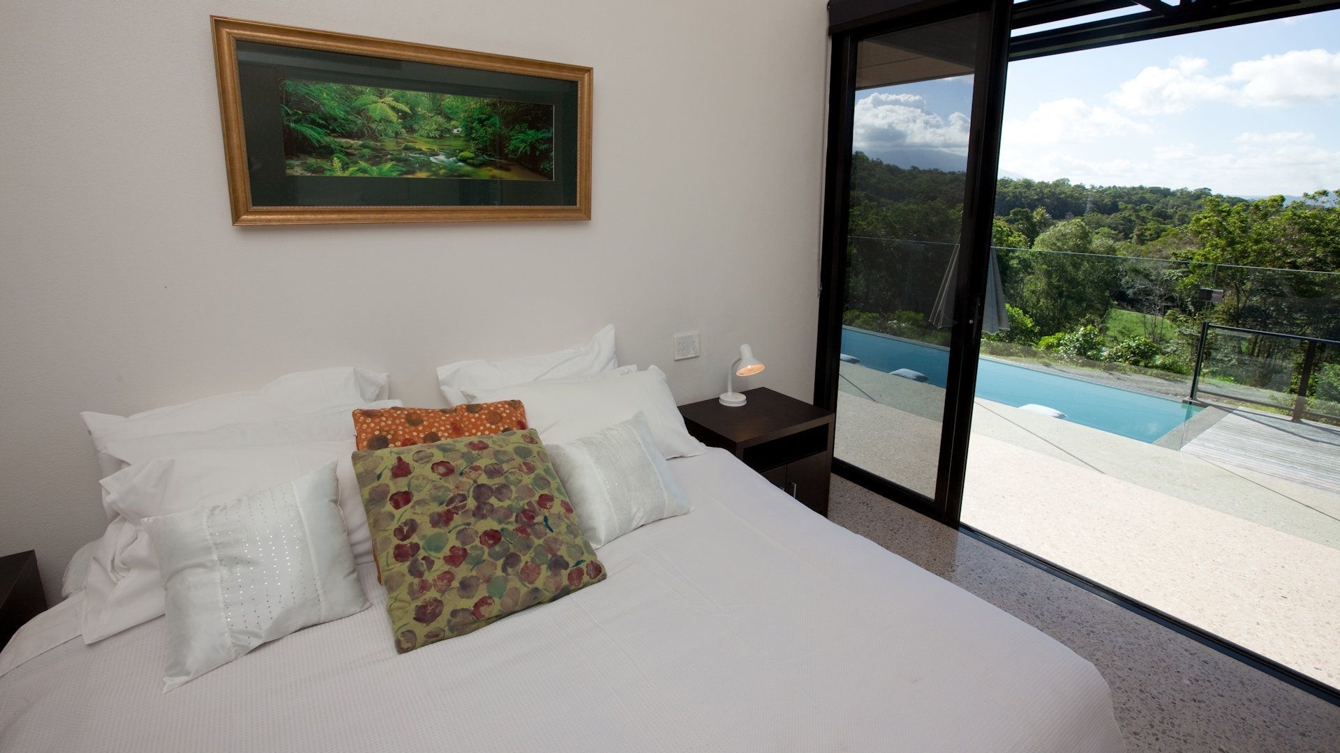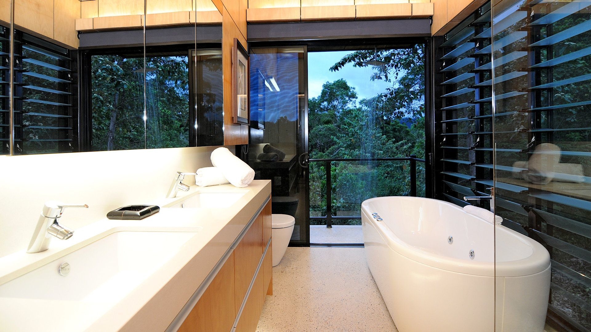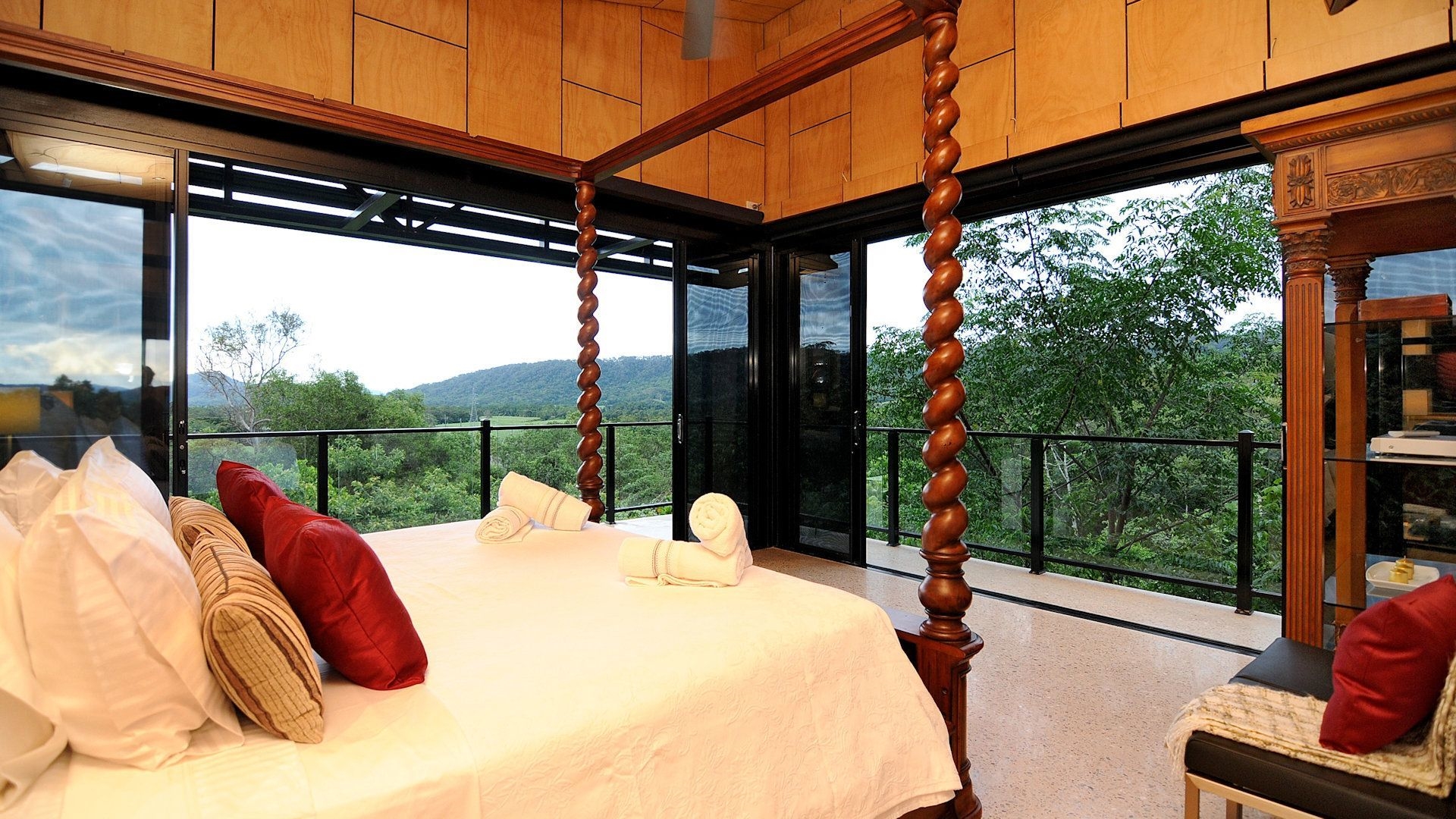The main pavilion features a fully equipped designer kitchen, sitting area and lounge room while a full bathroom overlooks a water feature with a designer stand alone bath. The living area capitalizes on views of the Douglas Shire, and is designed to maximize energy efficiency. Bedrooms are nestled in the rainforest for greater privacy.