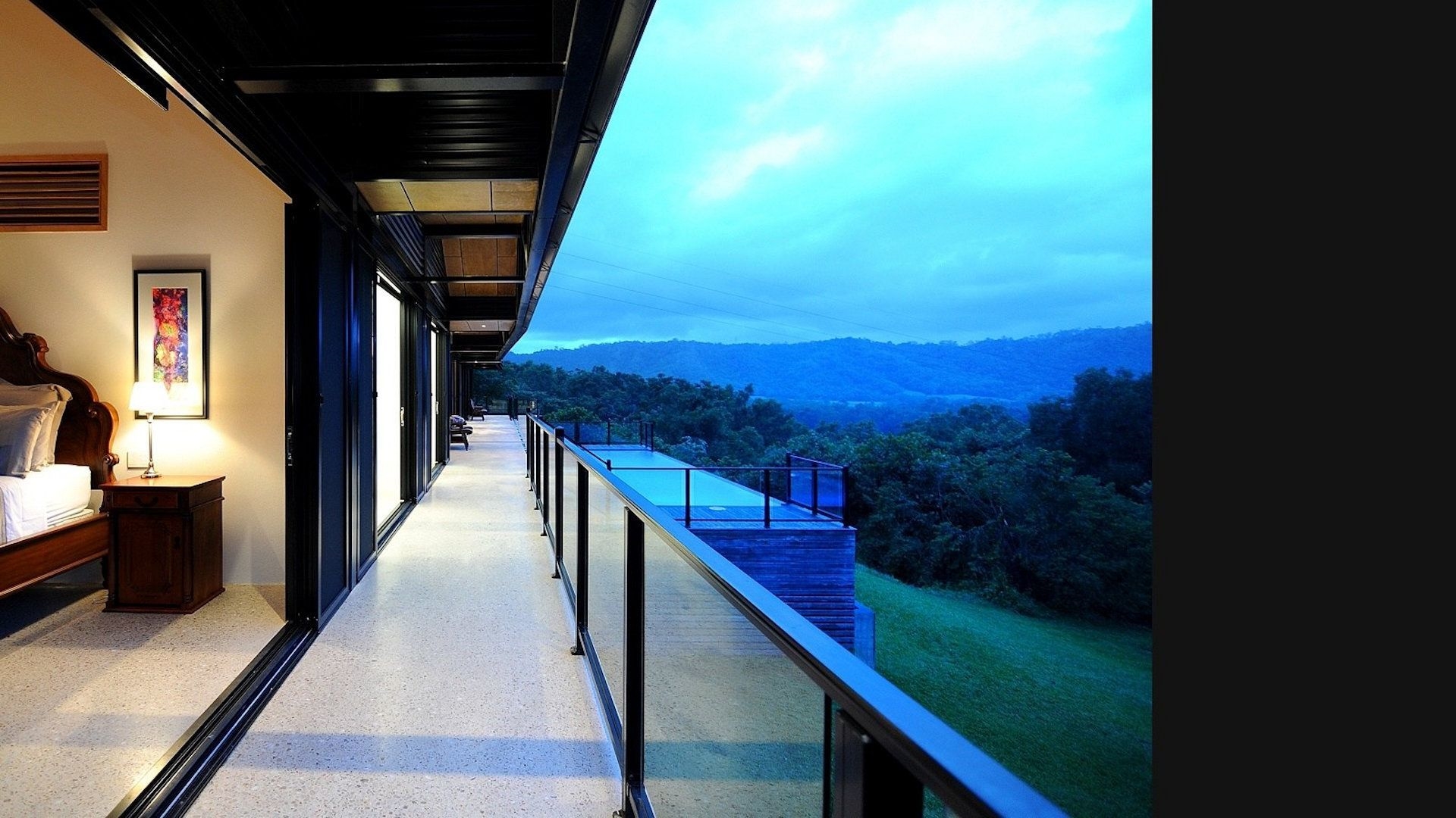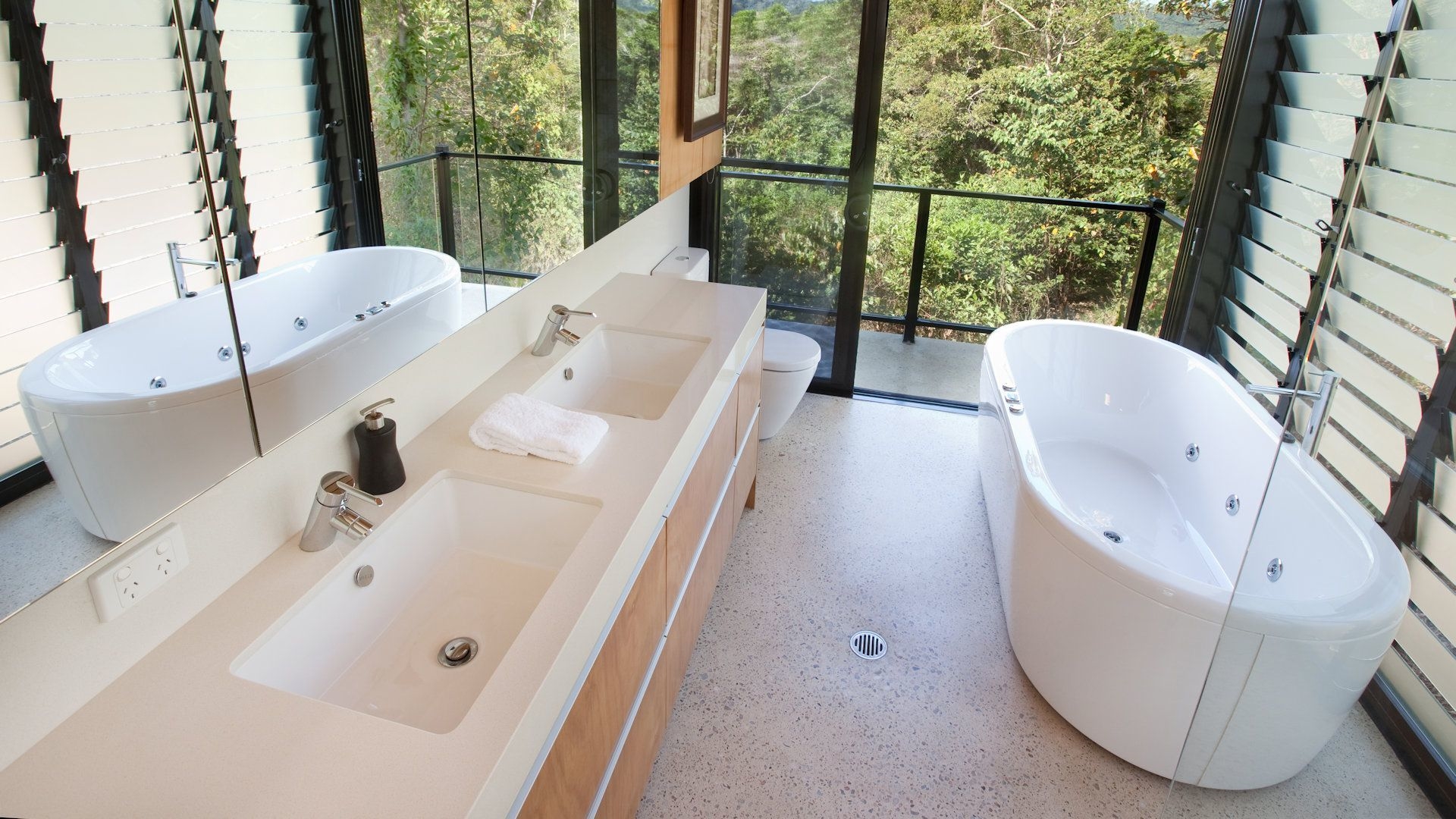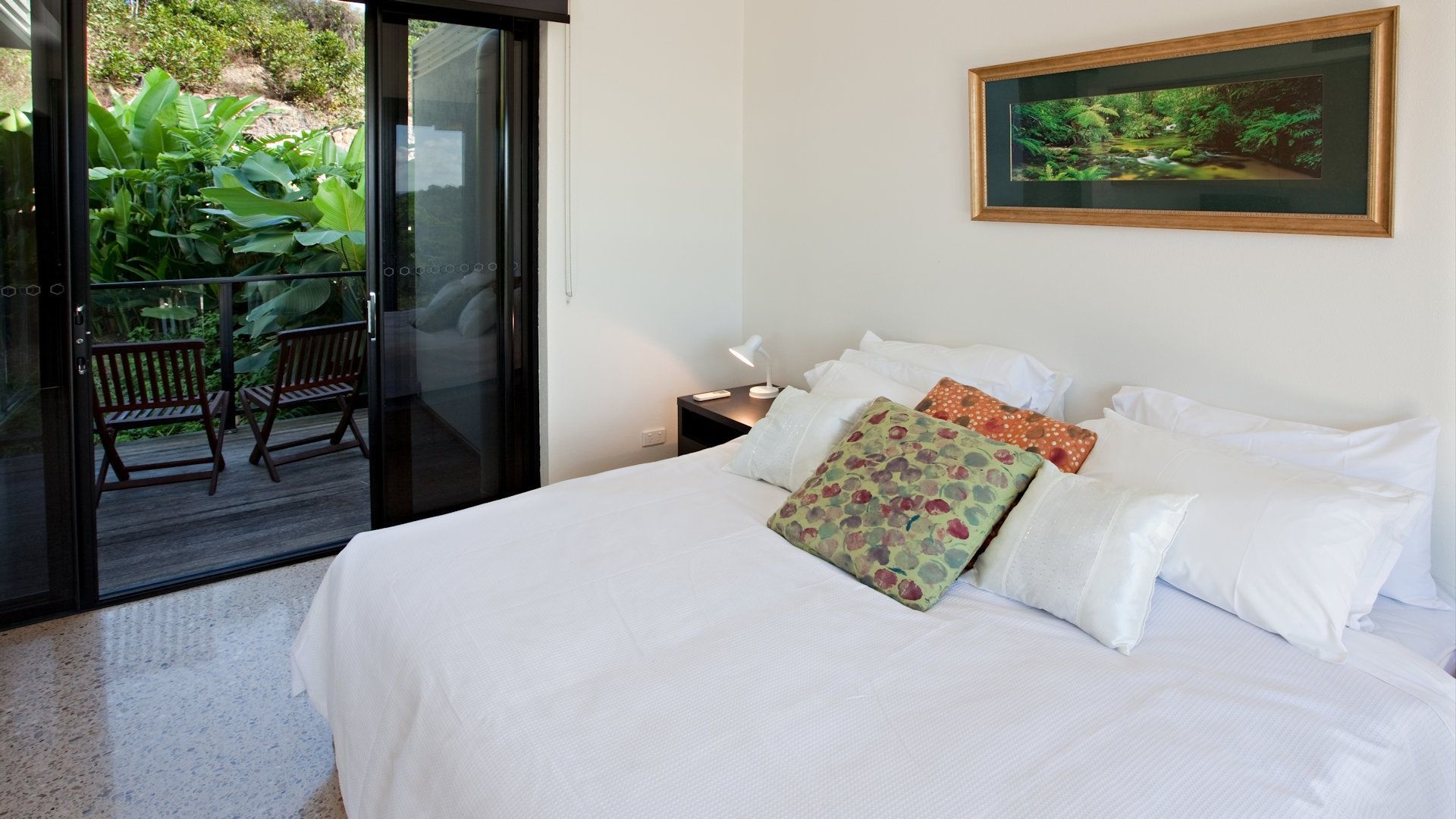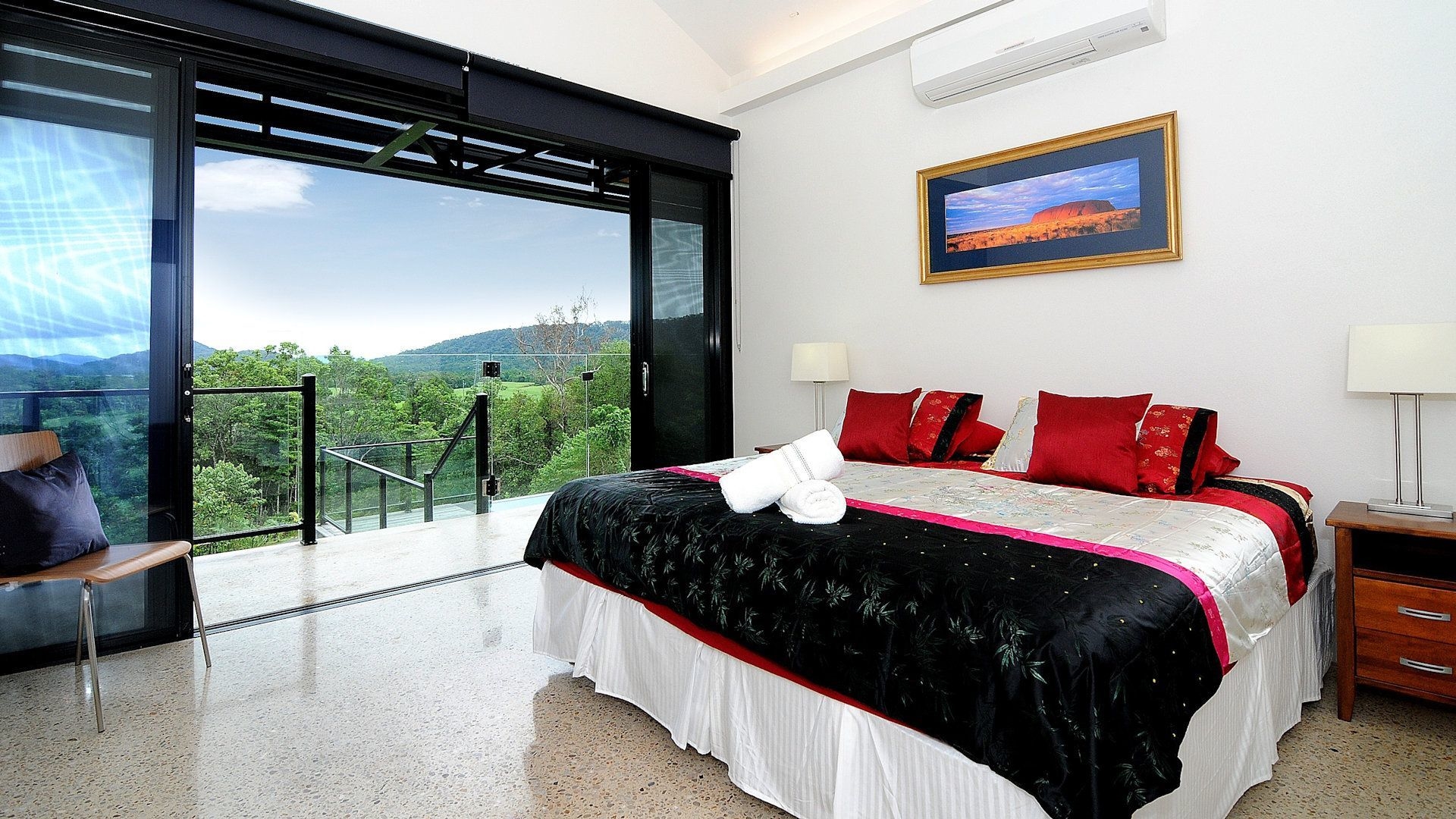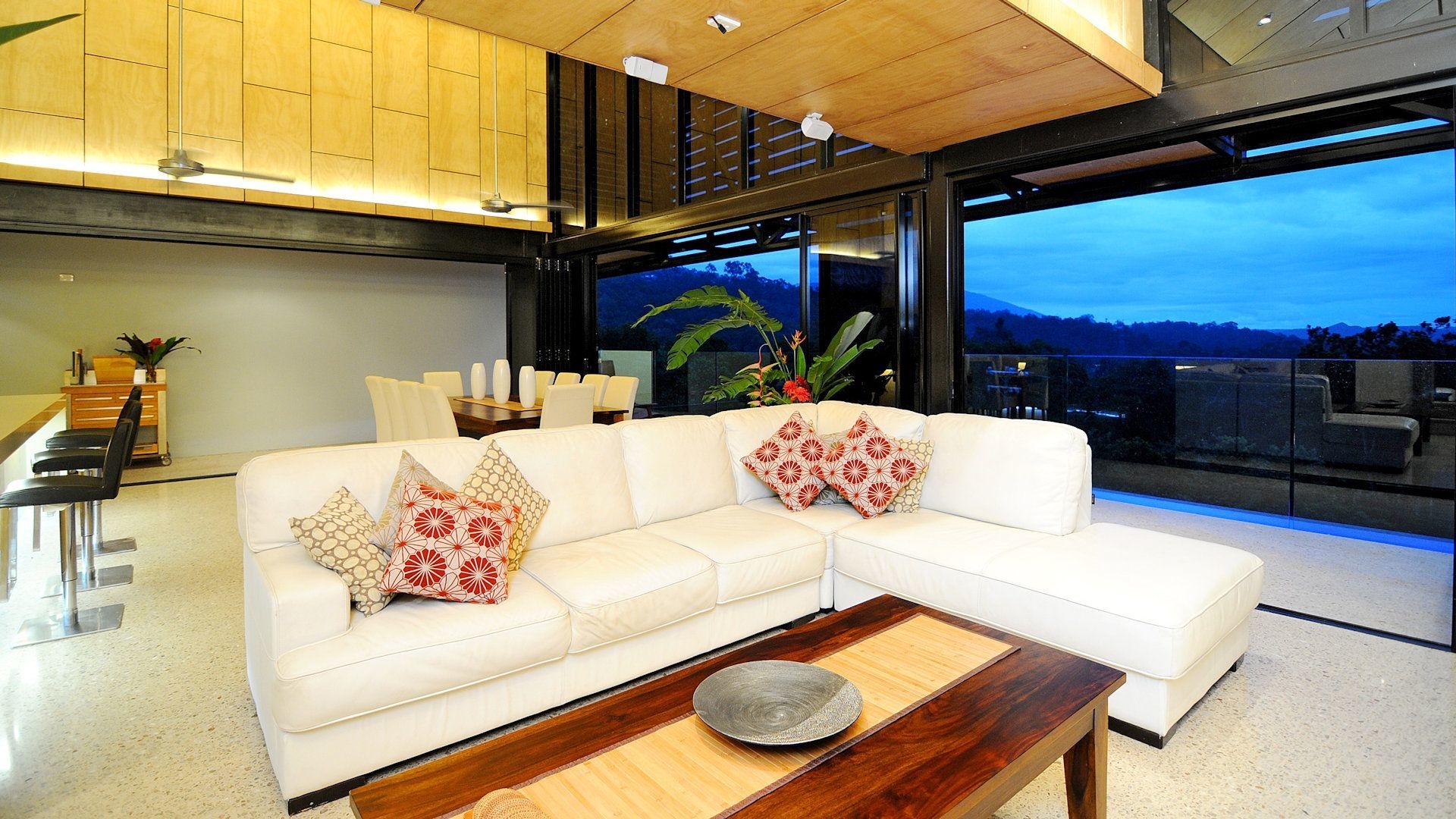 The main pavilion features a fully equipped designer kitchen, sitting area and lounge room while a full bathroom overlooks a water feature with a designer stand alone bath. The living area capitalizes on views of the Douglas Shire, and is designed to maximize energy efficiency. Bedrooms are nestled in the rainforest for greater privacy.